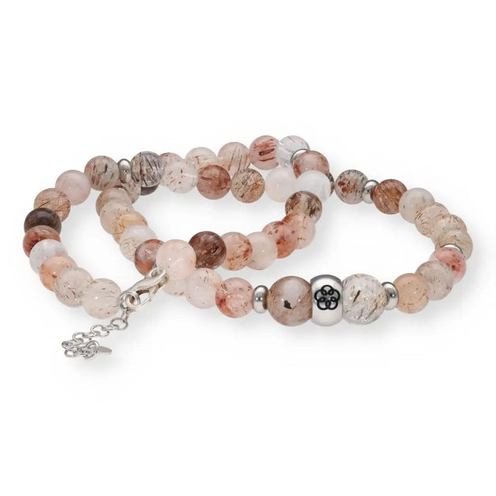 - Heilstein: Rutilquarz (Kette Ø11 und 8,5 mm) + Edelstahlteilchen + Edelstahlperle mit Energiespirale (Ø10 mm)