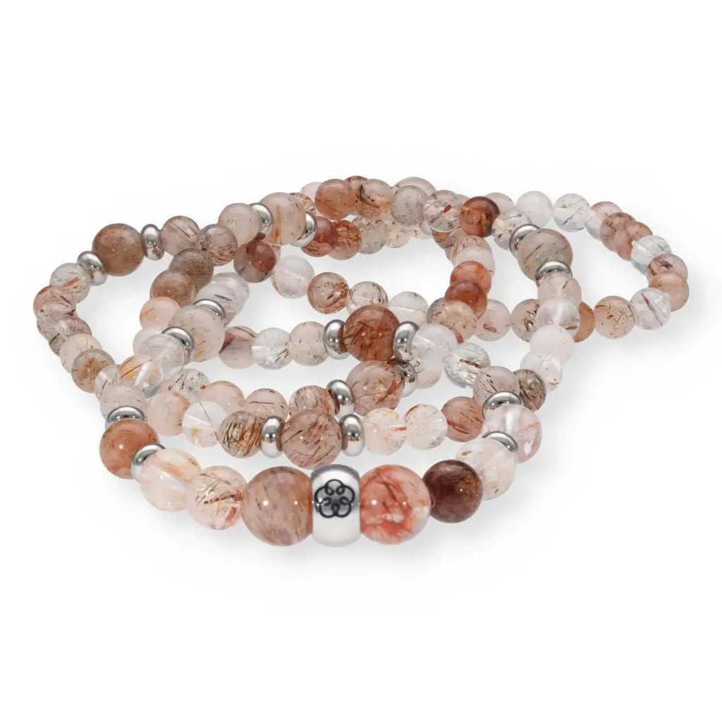 - Heilstein: Rutilquarz (Kette Ø11, 8,5 und 6,5 mm) + Edelstahlteilchen + Edelstahlperle mit Energiespirale (Ø10 mm)