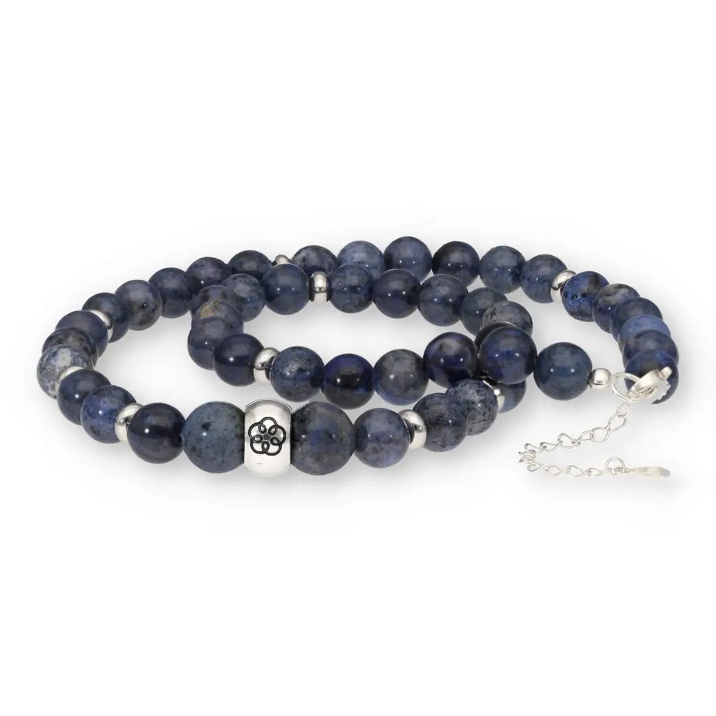 - Heilstein: Dumortierit (Kurzkette Ø 10 mm, 8 mm,) + Edelstahlteilchen + Edelstahlperle mit Energiespirale (Ø 8 mm)