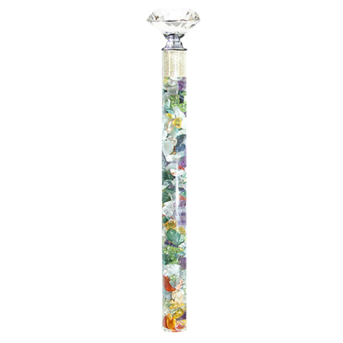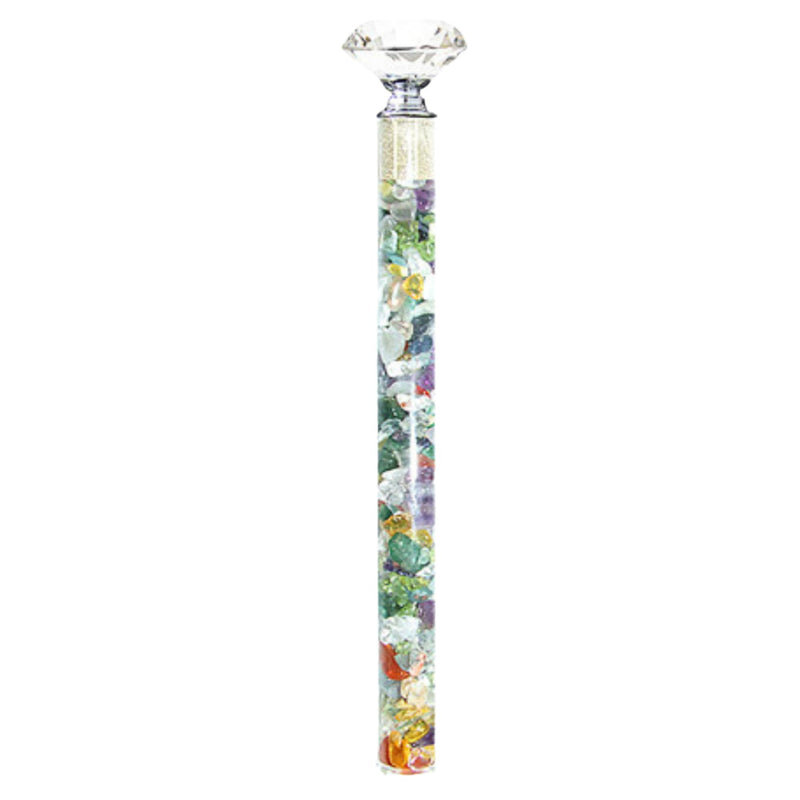 Der Diamant im Glas reinigt die Edelsteine und wirkt entstressend und belebend. Dadurch ist eine Reinigung des Stabes nicht notwendig. Dieser Wasserstab ist wie eine bunte Blumenwiese. AnwenderInnen berichten über seine energetisierende, ausgleichende und motivierende Wirkung. Aus Erfahrung wissen wir, wer mehr Lebenskraft und Lebensfreude benötigt, optimistisch in die Zukunft schauen möchte und einen Schuss mehr Selbstbewusstsein braucht, greift zu diesem Stab. Mit Bergkristall, Bernstein, Karneol, Aventurin, Amethyst und Naturdiamant.