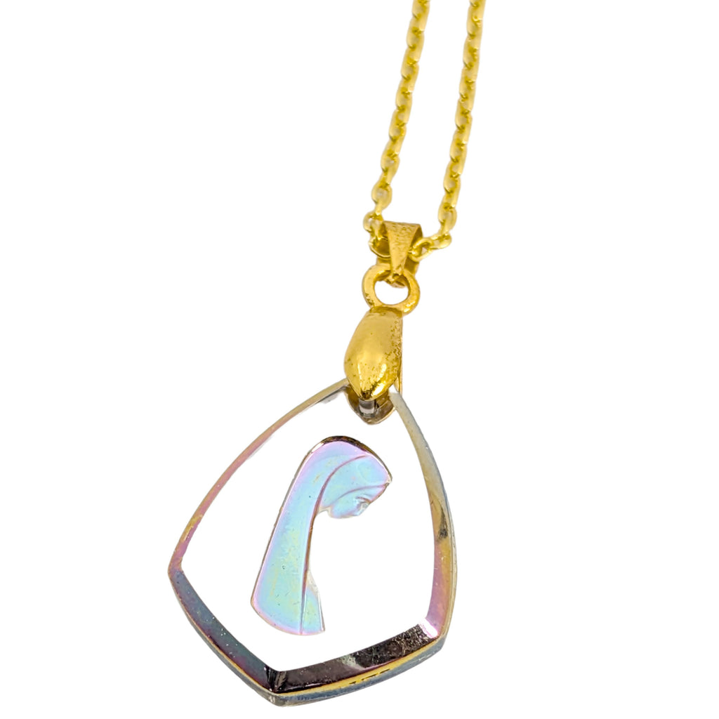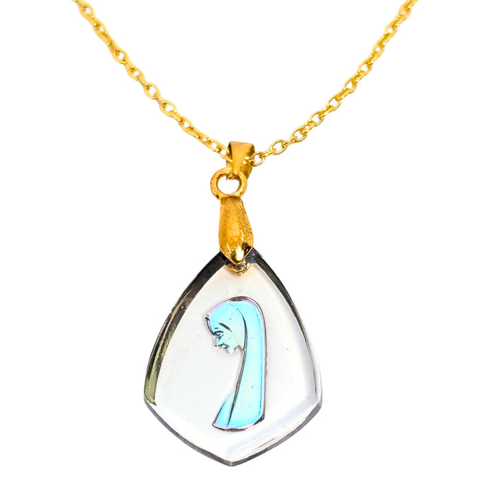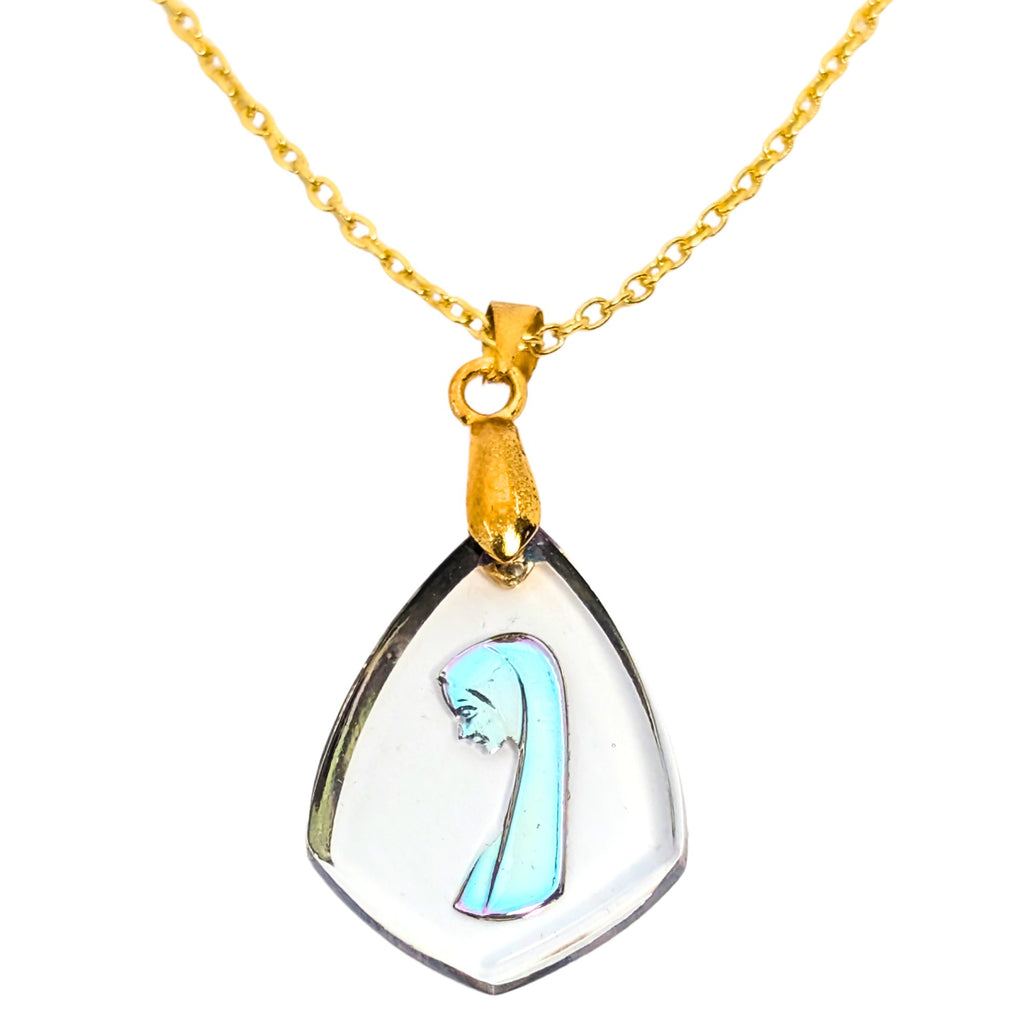 Beschreibung: Klarglasanhänger mit Madonnenmotiv, handgefertigt und vergoldet. Eventuelle Unregelmäßigkeiten sind Teil des Herstellungsprozesses.