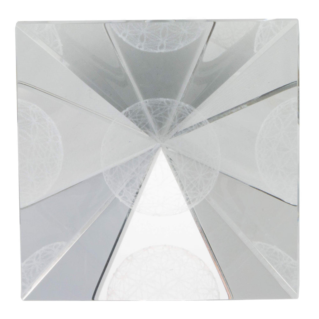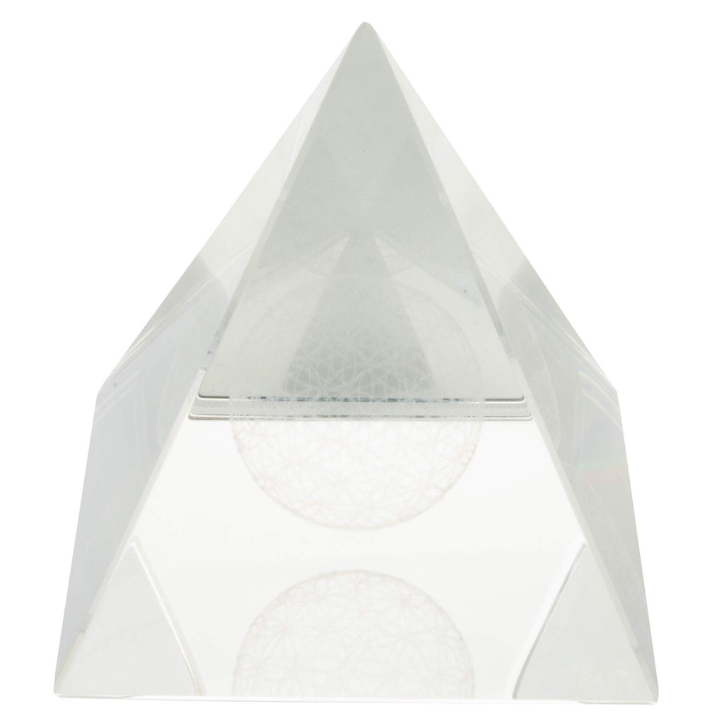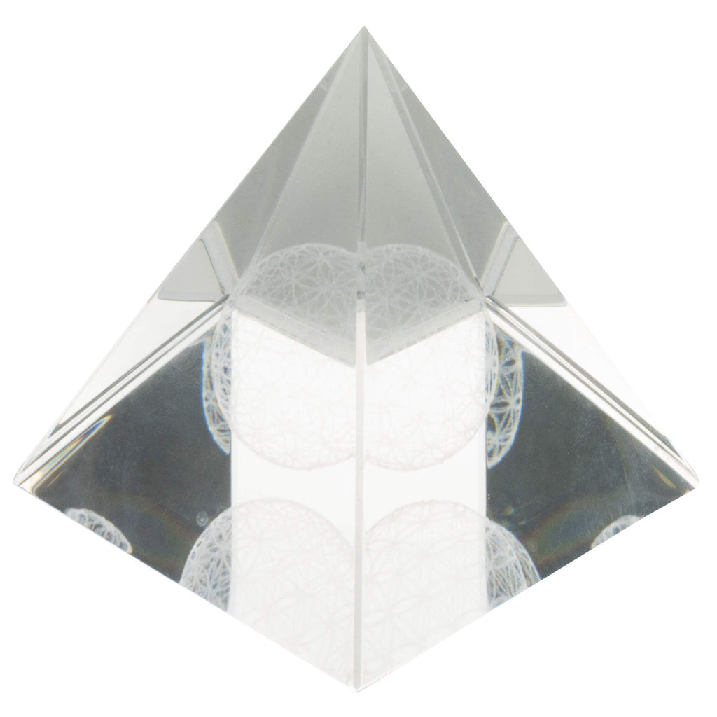 Die Glas - Kristallpyramide „Blume des Lebens" wurde aus Kristallglas gefertigt. Der Dekorationsgegenstand wurde mit dem Symbol der „Blume des Lebens" versehen, welche in der Lehre der Esoterik für die kosmische Ordnung steht. Die Kristallpyramide „Blume des Lebens" verfügt über eine Größe von etwa 6 cm und wird im Wohnraum platziert schnell zu einem schönen Eyecatcher.