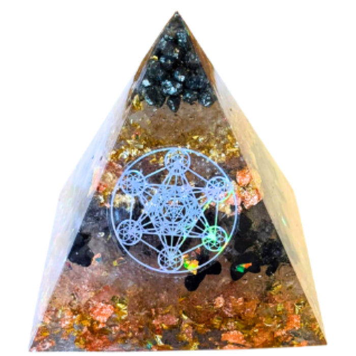 Manifestationspyramide aus Orgonit mit Pyrit, Bergkristall & Onyx