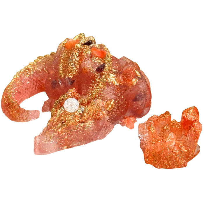 Orgonit Drache mit funkelnden Blattmetallen, Karneol, Rosenquarz, Amethysten und