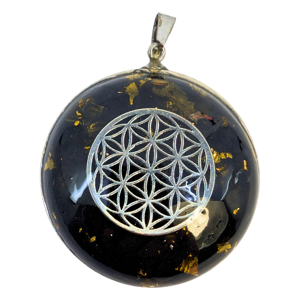 Im Zentrum wirkt eine Bergkristallkugel im vergoldeten Spiralkäfig, umgeben von reinem Silber, Schungit und Blattmessing – kraftvolle Materialien, die elektromagnetische Belastungen ausgleichen und deine Energiezentren stärken.