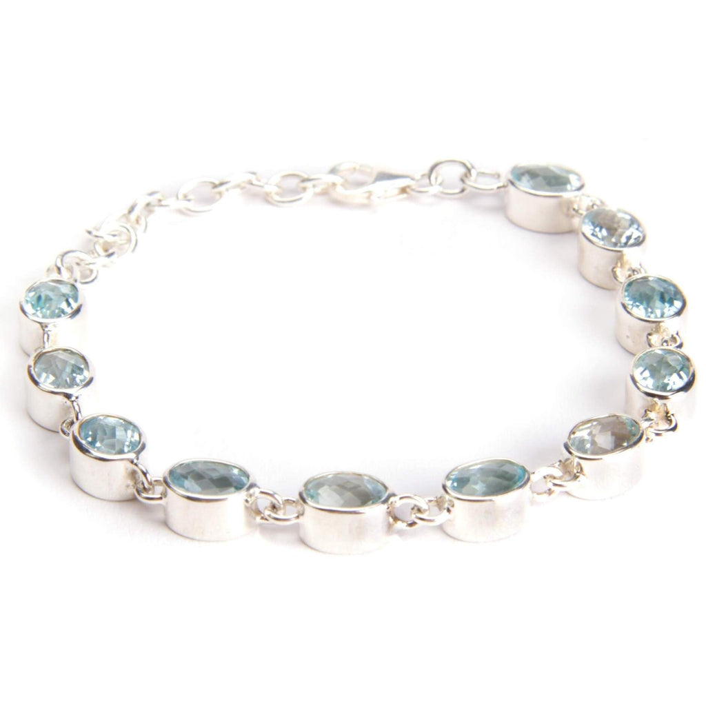 Das Armband mit Karabiner-Verschluss wird aus 925er Silber gefertigt und ist in verschiedenen Größen (von 17 bis 21 cm) zu tragen. Die aneinandergereihte Topase in feinster Qualität (AAA) sind ebenfalls in Silber eingefasst und in ovaler Form. Der zauberhafte Facettschlifft sorgt für ein wunderbares Funkeln am Handgelenk.